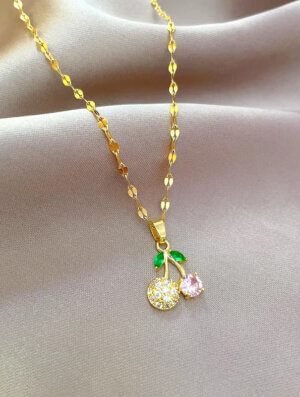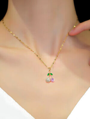 OUTLET Collar Cereza Rosa con un dije en bronce bañado en oro 18K de 2 cms, micro circones y una cadena en acero de 41 cms con cadena extensora de 5 cms. Diseño clásico y delicado para usarlo con tu ropa preferida, ya sea deportiva, formal o informal con un toque muy femenino, elegante y de moda. Para ver otros diseños disponibles en collares para mujer, da clic aca.