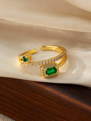 Anillo Mujer Cristal Esmeralda para mujer tono dorado y ajustable. Hermoso diseño para combinar y llevar donde quieras, ideal para tu look casual o informal, con un toque muy femenino, elegante, a la moda y único. Para ver mas diseños en anillos da clic aca. Este anillo se puede ajustar al tamaño del dedo por lo que no esta clasificado por tallas.