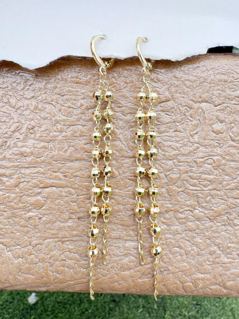 Aretes Mujer Brillo Urbano en tono dorado con largo de 8 cms. Diseño divertido, diferente con un estilo delicado para combinarlo como quieras, ideal para tu look casual o informal o ir a trabajar y con un toque muy femenino y de moda. Otros productos disponibles en aretes.