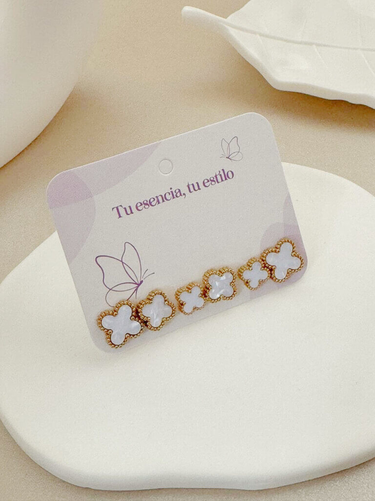 Set Acero Trebol Blanco por 3 pares en tono dorado en acero. Diseño original y diferente con un estilo delicado para combinarlo como quieras, ideal para tu look casual o informal o ir a trabajar y con un toque muy femenino y de moda. Otros productos disponibles en aretes.