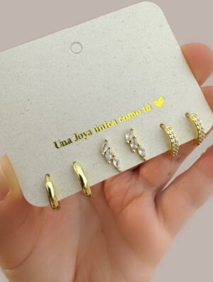 Set Aretes Brisa Silvestre en tono dorado en bronce bañados en oro 18K. Diseño original y diferente con un estilo delicado para combinarlo como quieras, ideal para tu look casual o informal o ir a trabajar y con un toque muy femenino y de moda. Otros productos disponibles en aretes.