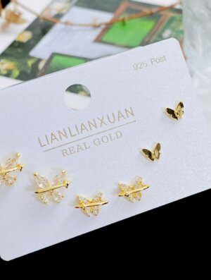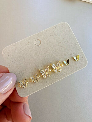 Set Aretes Entre Alas en tono dorado en bronce con baño en oro 18K y micro circones. Diseño original y diferente con un estilo delicado para combinarlo como quieras, ideal para tu look casual o informal o ir a trabajar y con un toque muy femenino y de moda. Otros productos disponibles en aretes.