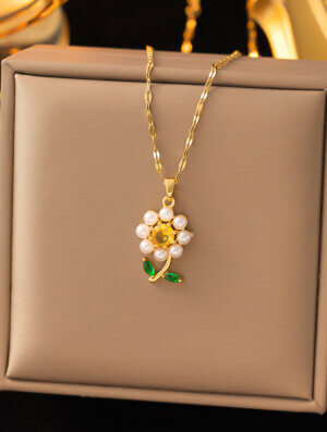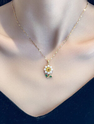 Collar Mujer Flor Encantada con cadena en acero y dije en bronce bañado en oro 18K y micro circones. Diseño clásico y delicado para usarlo con tu ropa preferida, ya sea deportiva, formal o informal con un toque muy femenino, elegante y de moda. Para ver otros diseños disponibles en collares para mujer, da clic aca.