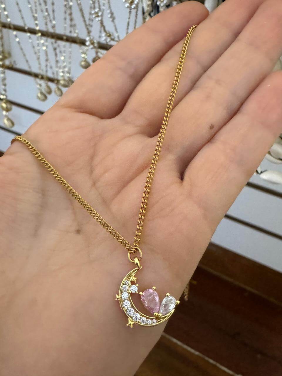 Collar Mujer Luna Romance con cadena en acero con largo de 42 cms y dije en bronce bañado en oro 18K y micro circones. Diseño clásico y delicado para usarlo con tu ropa preferida, ya sea deportiva, formal o informal con un toque muy femenino, elegante y de moda. Para ver otros diseños disponibles en collares para mujer, da clic aca.
