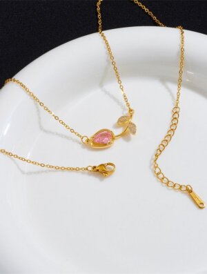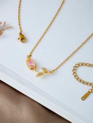 Collar Mujer Tulipan Rosa en bronce bañado en oro 18K, dije con micro circones, con largo de 42 cms y cadena extensora de 5 cms. Diseño clásico y delicado para usarlo con tu ropa preferida, ya sea deportiva, formal o informal con un toque muy femenino, elegante y de moda. Para ver otros diseños disponibles en collares para mujer, da clic aca.