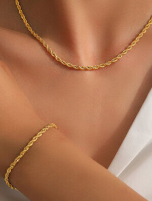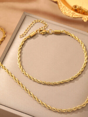 Set Acero Instante Dorado en tono dorado con largo de cadena de 40 cms y pulsera 15 cms. Diseño clásico y delicado para usarlo con tu ropa preferida, ya sea deportiva, formal o informal con un toque muy femenino, elegante y de moda. Para ver otros diseños disponibles en collares para mujer, da clic aca.