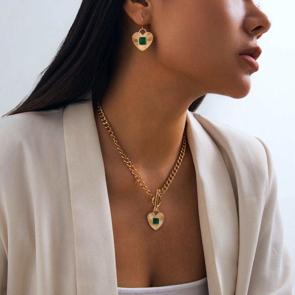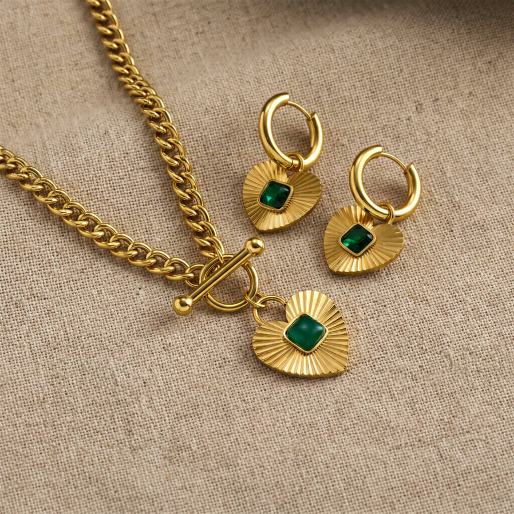 Set Acero Latido Esmeralda en tono dorado con largo de cadena de 49 cms, tamaño dijes y aretes 3.5 cms. Diseño clásico y delicado para usarlo con tu ropa preferida, ya sea deportiva, formal o informal con un toque muy femenino, elegante y de moda. Para ver otros diseños disponibles en collares para mujer, da clic aca.