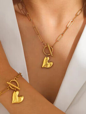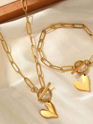Set Acero Latido Puro en tono dorado que incluye aretes, collar y pulsera. Diseño clásico y delicado para usarlo con tu ropa preferida, ya sea deportiva, formal o informal con un toque muy femenino, elegante y de moda. Para ver otros diseños disponibles en collares para mujer, da clic aca.