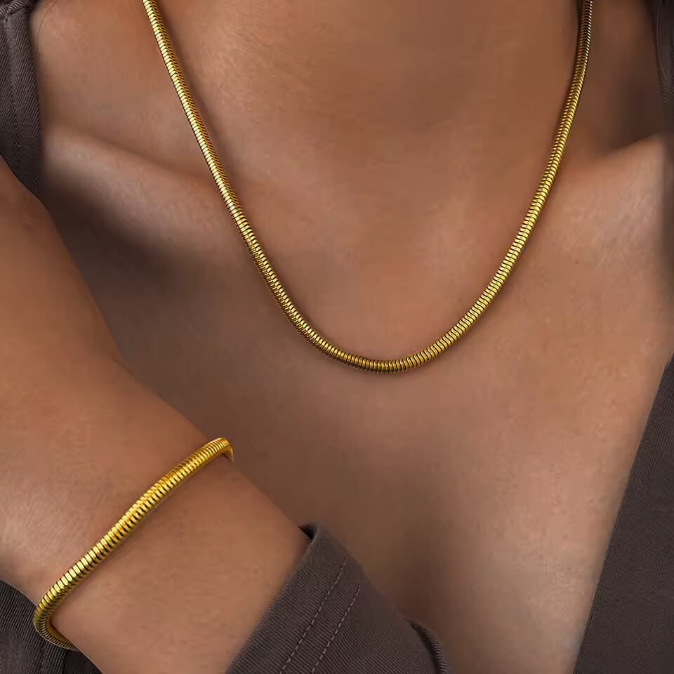 Set Acero Linea Dorada en tono dorado que incluye collar y pulsera. Diseño clásico y delicado para usarlo con tu ropa preferida, ya sea deportiva, formal o informal con un toque muy femenino, elegante y de moda. Para ver otros diseños disponibles en collares para mujer, da clic aca.