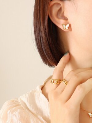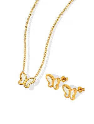 Set Acero Mariposa Luminosa en tono dorado con largo de cadena de 39 cms y aretes de 1.2 cms. Diseño clásico y delicado para usarlo con tu ropa preferida, ya sea deportiva, formal o informal con un toque muy femenino, elegante y de moda. Para ver otros diseños disponibles en collares para mujer, da clic aca.