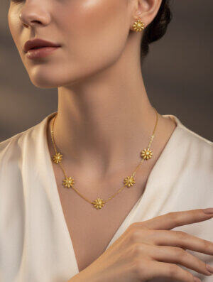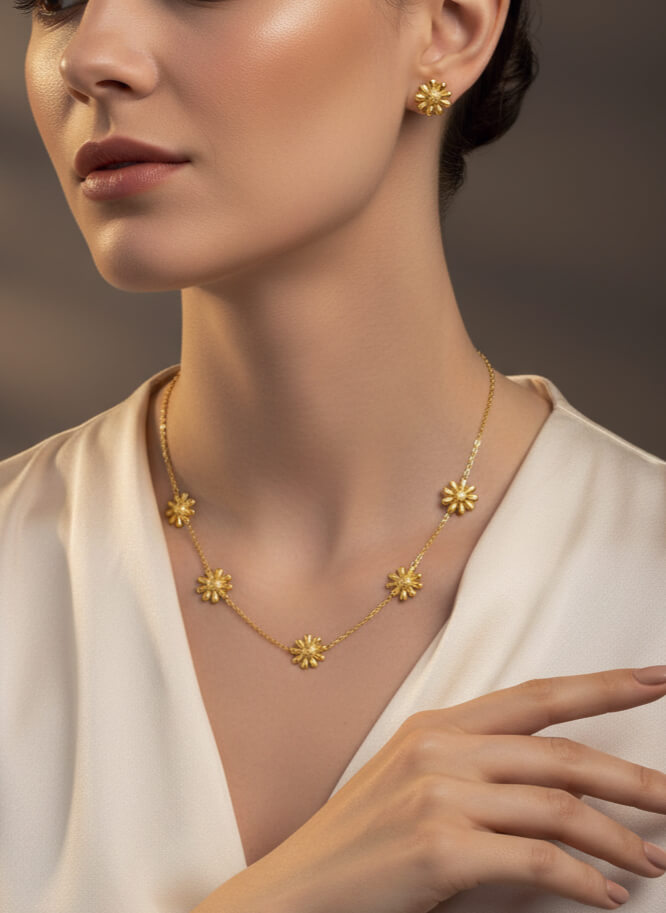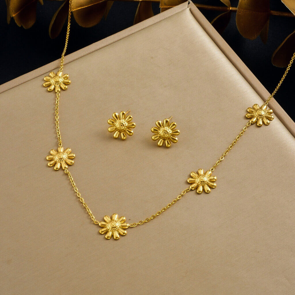 Set Acero Mujer Floralia en tono dorado con largo de cadena de 40 cms, tamaño dijes y aretes 0.6 cms. Diseño clásico y delicado para usarlo con tu ropa preferida, ya sea deportiva, formal o informal con un toque muy femenino, elegante y de moda. Para ver otros diseños disponibles en collares para mujer, da clic aca.