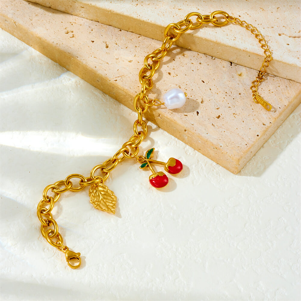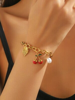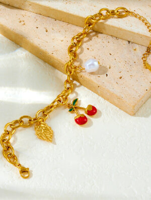 Pulsera Acero Brillo de-Cereza en tono dorado con tamaño de 16.5 y cadena extensora de 5 cms. Lindo diseño con un toque muy femenino y delicado para usar en cualquier ocasión y lucir a la moda. Para ver mas diseños en pulseras disponibles para mujer, da clic aca. El acero si se puede mojar y nuestros artículos en este material tienen 2 meses de garantía.