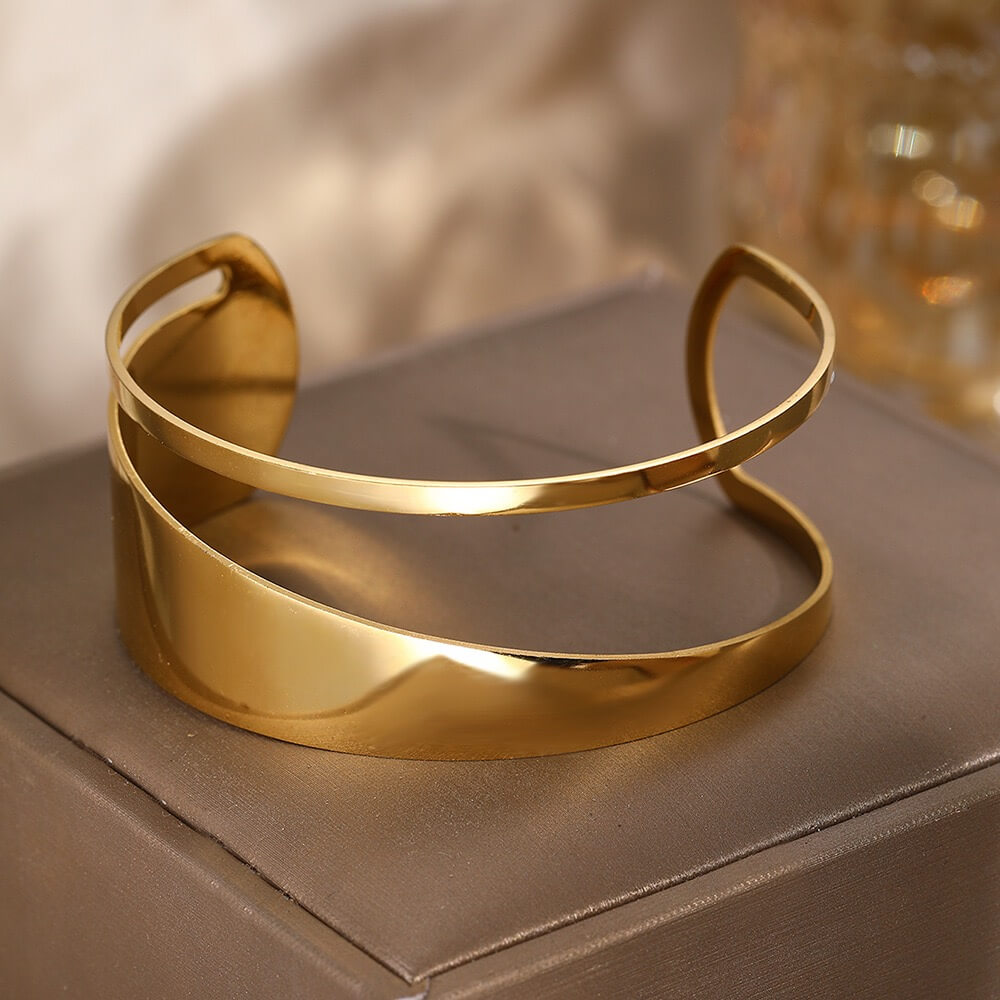 Pulsera Acero Deslumbra en tono dorado rígida con diámetro de 7 cms. Lindo diseño con un toque muy femenino y delicado para usar en cualquier ocasión y lucir a la moda. Para ver mas diseños en pulseras disponibles para mujer, da clic aca. El acero si se puede mojar y nuestros articulos en este material tienen 2 meses de garantía.