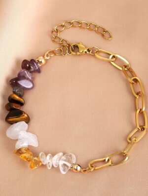 Pulsera Acero Piedra Luminosa en tono dorado con piedra tipo natural, largo de 17 cms y cadena extensora de 5 cms. Lindo diseño con un toque muy femenino y delicado para usar en cualquier ocasión y lucir a la moda. Para ver mas diseños en pulseras disponibles para mujer, da clic aca. Los productos en acero se pueden mojar.