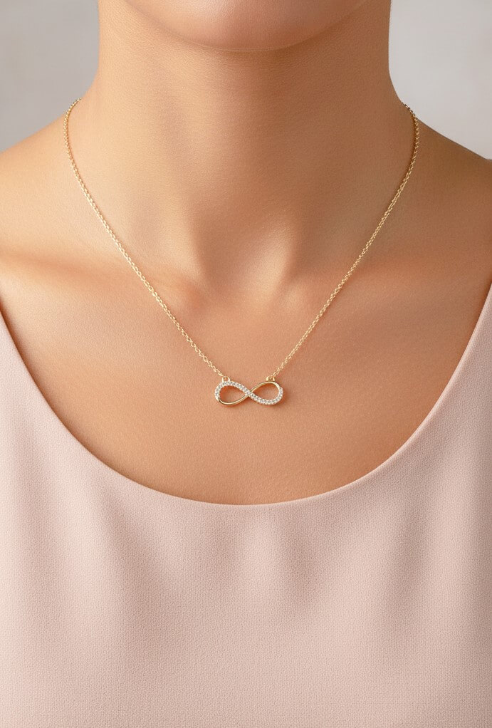 Collar Mujer Infinito Sereno en tono dorado en cobre con baño en oro 14 K con largo de 39 cms y cadena extensora de 5 cms. Lindo diseño con un toque muy femenino y delicado para usar en cualquier ocasión y lucir a la moda. Para ver mas diseños en pulseras disponibles para mujer, da clic aca.