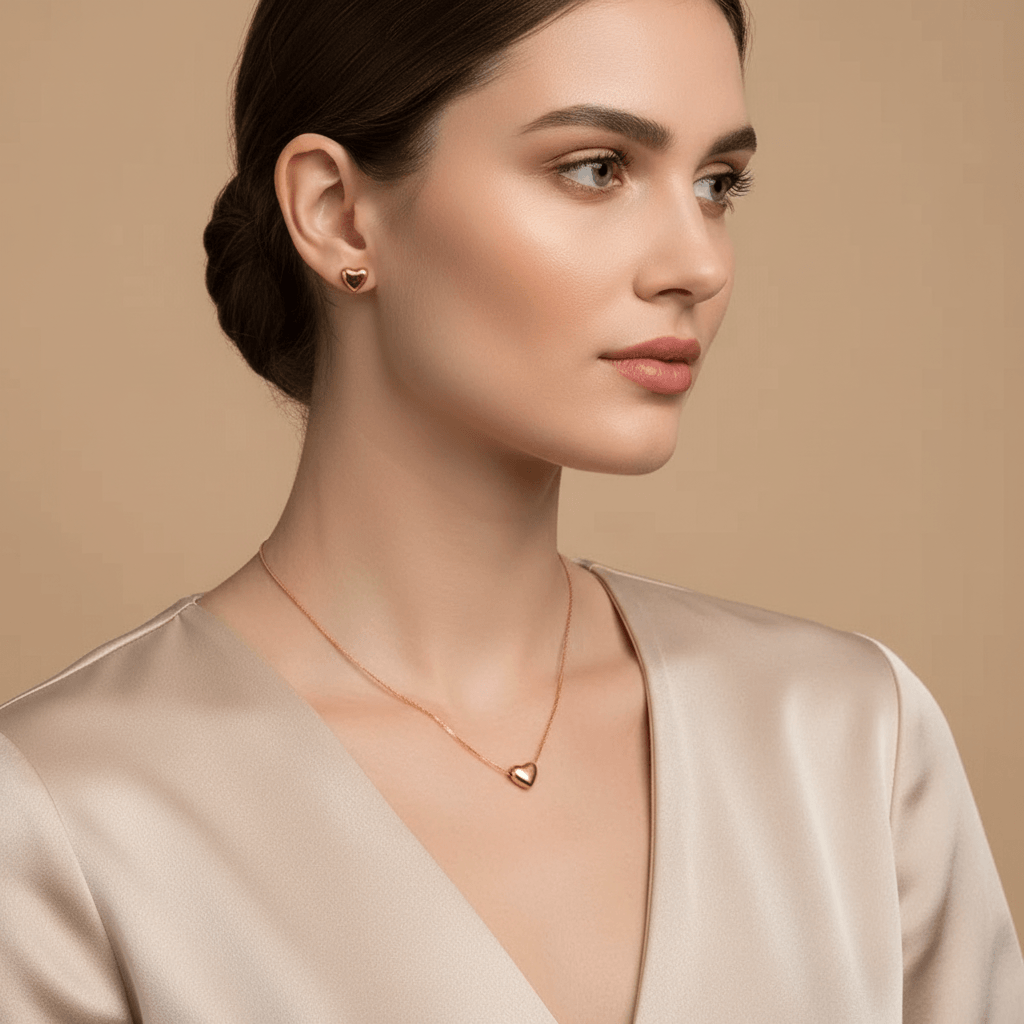 OUTLET Set Corazon Puro en tono dorado con largo de cadena de 40 cms, tamaño dijes y aretes 0.6 cms. Diseño clásico y delicado para usarlo con tu ropa preferida, ya sea deportiva, formal o informal con un toque muy femenino, elegante y de moda. Para ver otros diseños disponibles en collares para mujer, da clic aca.